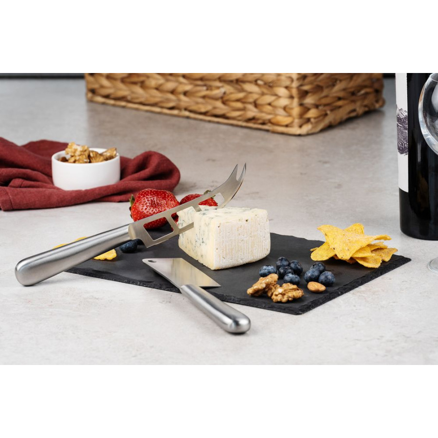Выполненная из сланца доска идеальна для подачи закусок. В комплекте сланцевая доска, нож-топорик для твердых сортов сыра, нож для сыров средней мягкости.