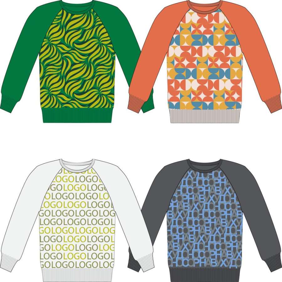 Модель: джемпер, модель унисекс, рукав — реглан, полочка — жаккард, 2–3 цвета нитей, спинка и рукава однотонные — кулирная гладь.