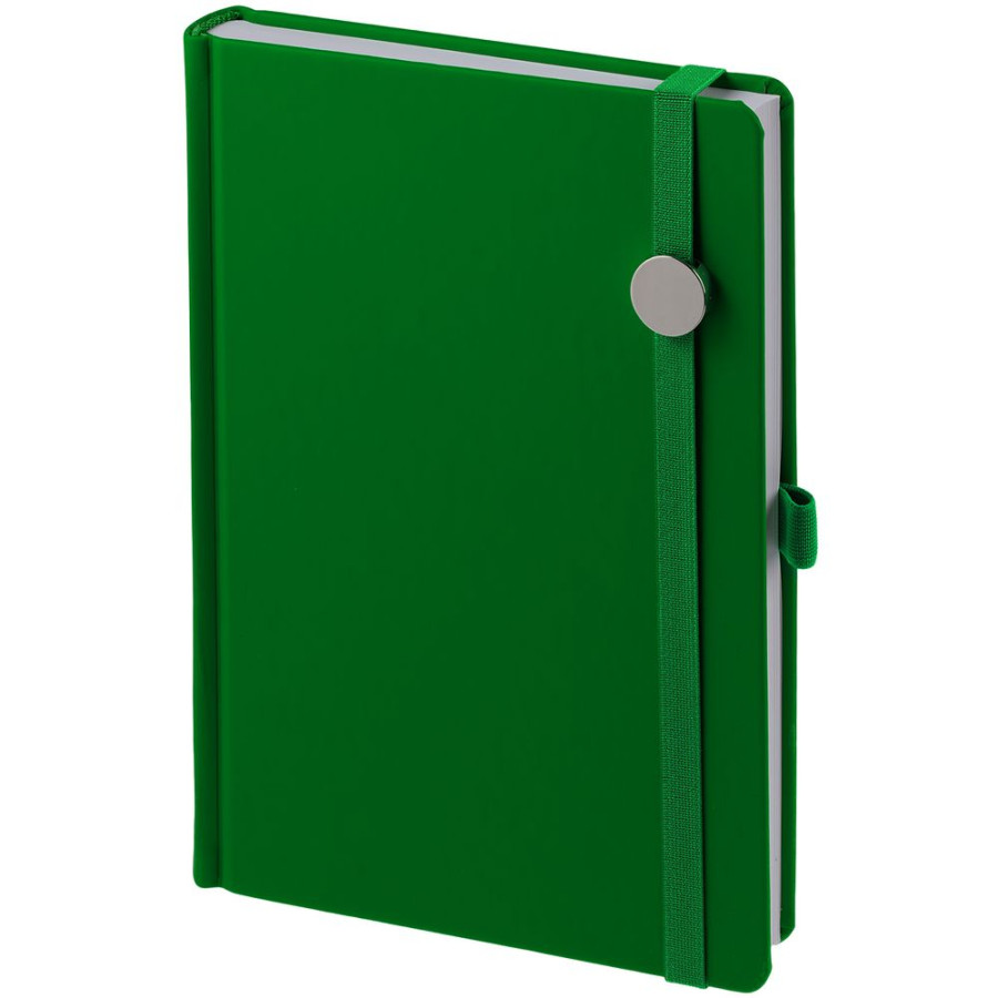 Ежедневник с твердой обложкой без поролона, выполнен из материала Soft Touch Ultra, зеленый FF, дополнен резинкой шириной 1 см, петлей-резинкой для ручки, капталом и ляссе ярко-зеленого цвета.