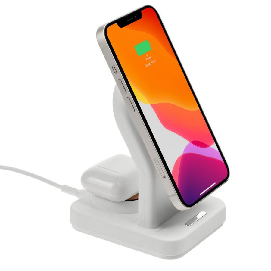iPhone 12–15 c магнитами MagSafe могут удерживаться на основной области станции. Ранние или компактные модели iPhone или смартфоны с диагональю 5, 7–6" на OS Android можно оснастить специальным адаптером Magmate или чехлом со встроенным кольцевым магнитом сзади.