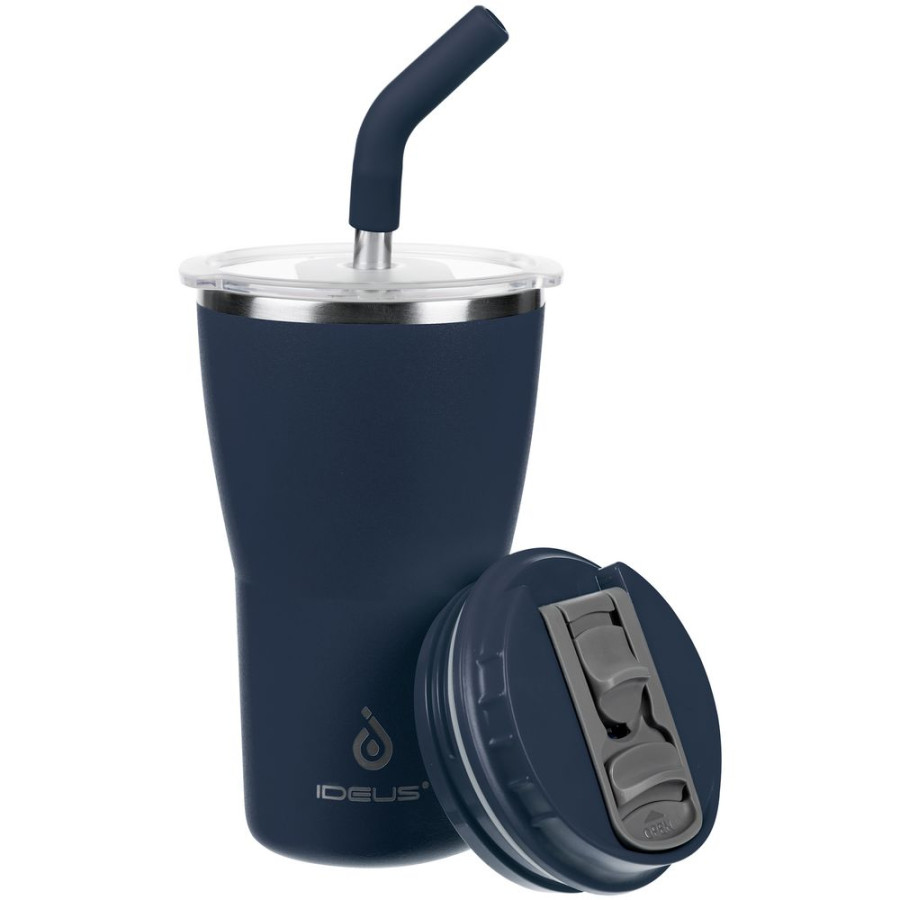 - 2 крышки в комплекте: одна на 100% герметичная с механизмом блокировки отверстия для питья, вторая — с отверстием для трубочки