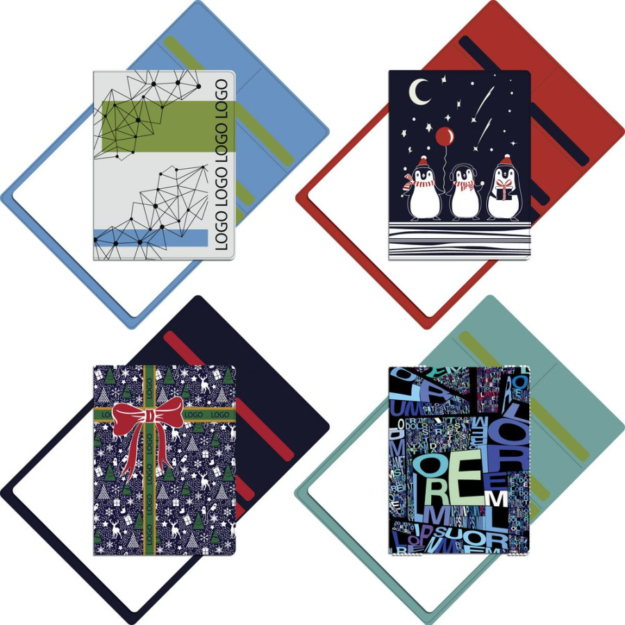 Снаружи искусственный материал белого цвета, имитирующий сафьяновую кожу, внутри — экокожа с эффектом софт-тач. Варианты цветов можно посмотреть в разделе «Фотографии».