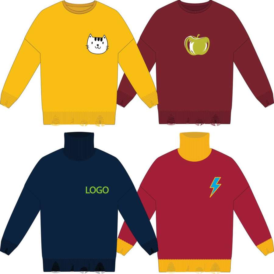 Свитер унисекс с вывязанным логотипом и индивидуальным рисунком в фирменной цветовой гамме.