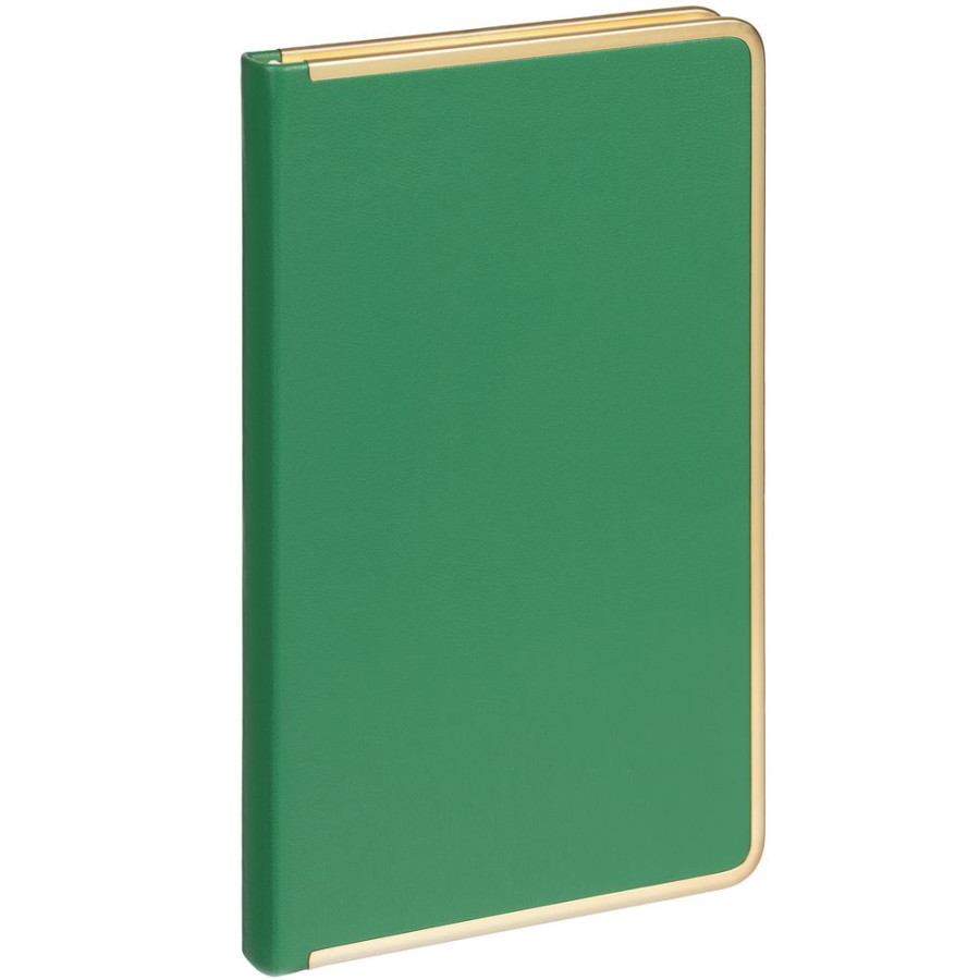 Изящный ежедневник с зауженным блоком и стильными деталями — металлической окантовкой на обложке и металлизированным обрезом.