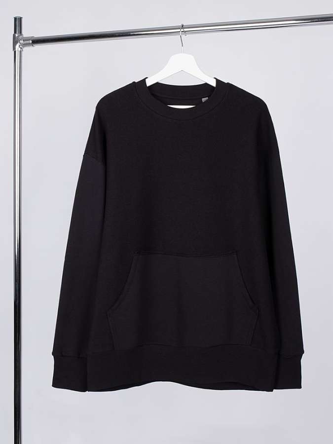 Благодаря особой конструкции, где часть деталей — перед и спинка — вывернута наизнанку, свитшот приобретает запоминающийся вид. Так внутренняя, обычно незаметная сторона материала превращается в лицевую: миниатюрные петельки бывшей изнанки становятся настоящим украшением толстовки, добавляя ей оригинальности и эффект невероятно приятной плюшевости.