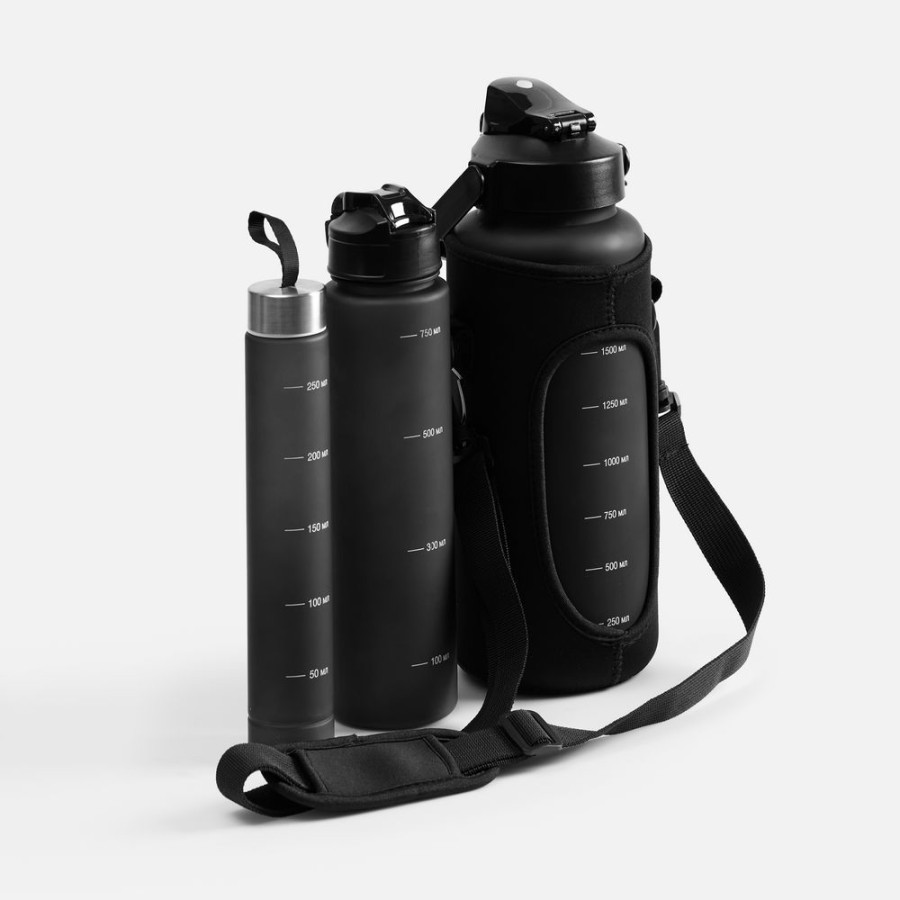 «Папа, мама, я — спортивная семья! ». Набор спортивных бутылок Aquapack — настоящая находка: это три емкости разного объема, вложенные одна в другую по принципу матрешки. Прочные и эстетичные бутылки с черным матовым покрытием подойдут для тренировок, спортивных мероприятий, туристических походов и семейных пикников на природе.