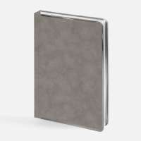 Ежедневник с твердой обложкой и серебристым обрезом блока. Выполнен из материала Nubuck, серый СС, дополнен серым ляссе и металлическими рамками с двух сторон обложки.