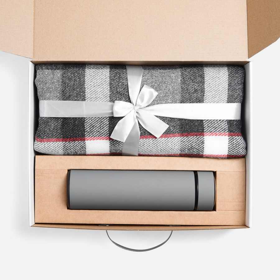 | Материал: | плед - шерсть, 15%; хлопок, 5%; полиэстер 60%; акрил, 20%, плотность 200 г/м²; термос - нержавеющая сталь, 304; покрытие софт-тач; коробка - картон |