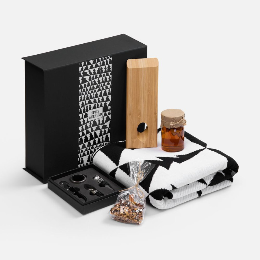 Набор Spicy Weekend создан специально для томных и непременно согревающих уикендов: в такой компании получится устроить настоящий праздник удовольствия и вкуса. Функциональные винные аксессуары подарят комфорт и добавят эстетики, а мед и традиционные специи придадут домашнему глинтвейну особенный вкус и аромат. Цветовой акцент набора — стильный монохромный плед, станет обязательным атрибутом уютного зимнего вечера.