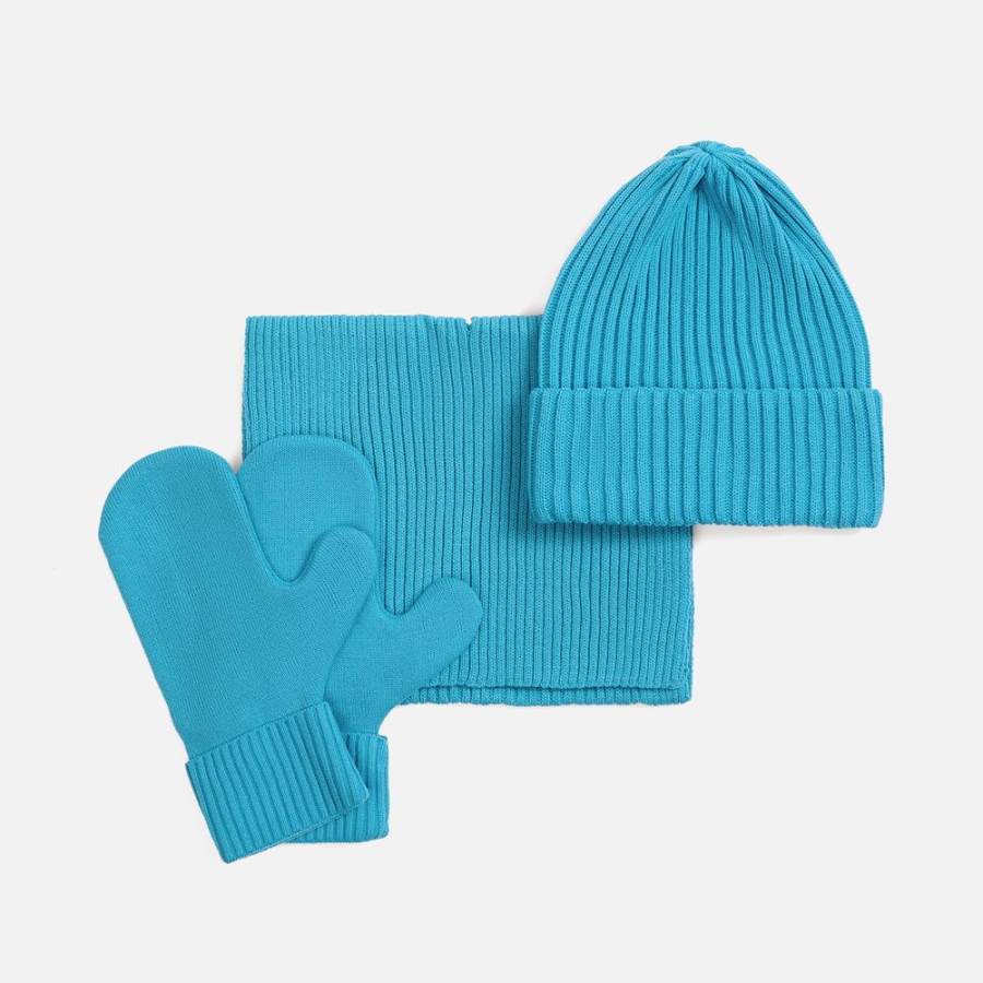 В набор входят удобный шарф с технологичным отверстием для быстрого завязывания, шапка с двойным отворотом и теплые двухслойные варежки с широкой манжетой. Все изделия связаны из акриловой пряжи, отличаются практичностью и элегантной простотой.