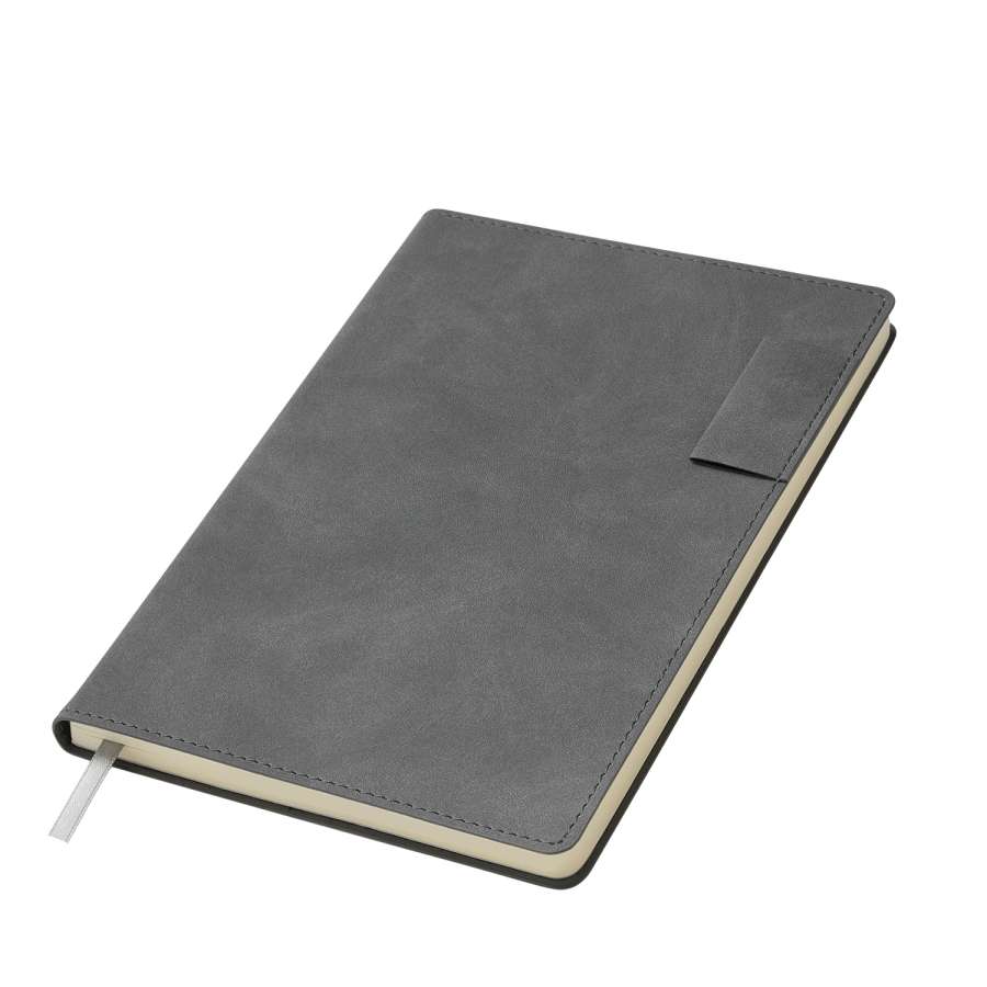 Мягкий на ощупь материал с мелкими вкраплениями имитирует натуральную замшу, а петелька для ручки добавляет практичности. Сдержанные оттенки обложки, форзаца и нахзаца гармонично сочетаются между собой.