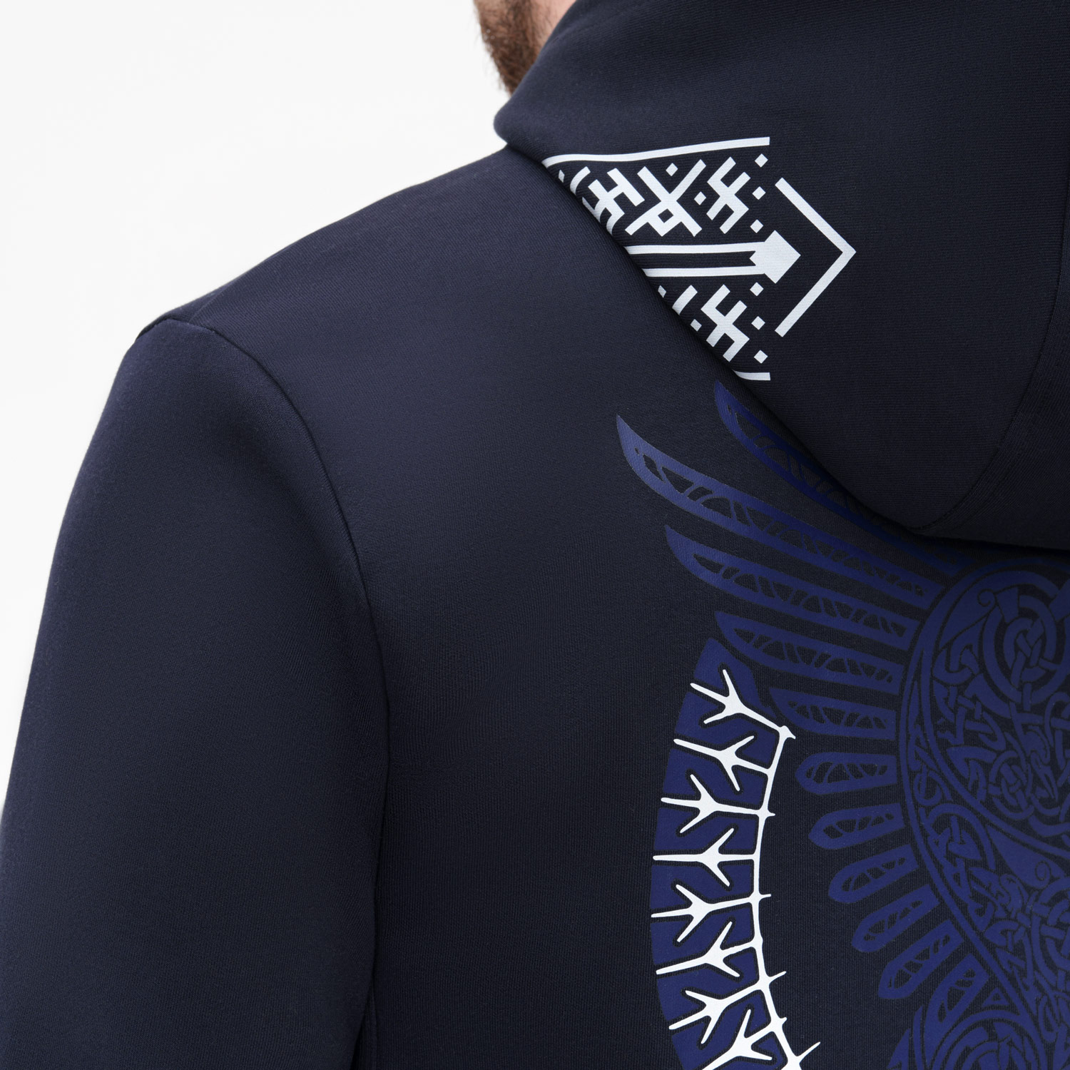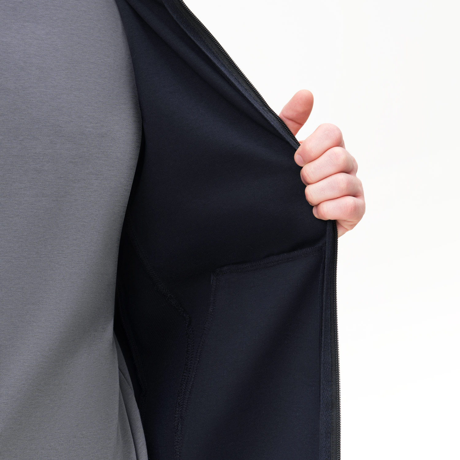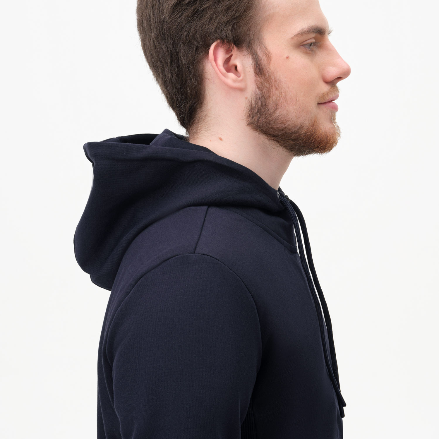 Толстовка сделана из мягкой и прочной ткани интерлок "doubleface", которая приятна к телу и легка в уходе, не растягивается, не выцветает и не деформируется после стирки. Манжеты и низ сделаны из плотной резинки 1х1, благодаря чему вещь держит форму. Карманы на потайных молниях придают толстовке аккуратный вид. Капюшон на подкладке в тон регулируется шнурками.