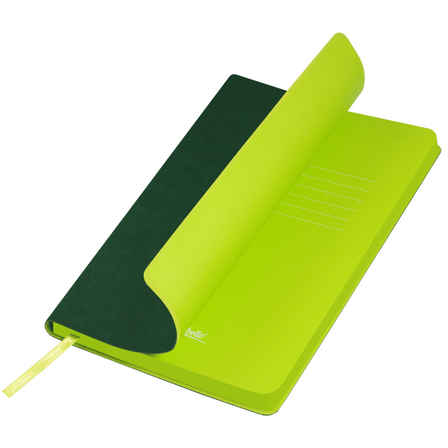 Ежедневник Latte New примечателен своим минималистичным, но завершенным и ярким дизайном. Выдающийся внешний вид аксессуара обусловлен удачным сочетанием оттенков зеленого. Гибкая обложка с закругленными уголками выполнена из приятного на ощупь, слегка прорезиненного материала. Она не образует заломов, не расслаивается и устойчива к повреждениям. Покрытие обложки имеет едва заметный блеск и мелкозернистый рисунок, имитирующий искусственную кожу. Яркий внешний вид создается контрастными элементами: насыщенный и свежий темно-зелёный, слегка припудренный цвет обложки сочетается с ярким лимонным цветом форзаца и среза. Форзац, нахзац и срез матовые. Кремовые скругленные страницы выполнены из шелковистого офсета. Они гармонично оттеняют свежесть основных цветов, уравновешивая цветовую композицию. Гладкое атласное лимонное ляссе с легким отливом выполнено в тон форзаца.