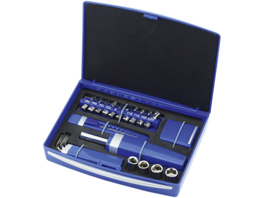 Набор нужных в быту инструментов в количестве 20 штук прекрасно размещается в прочном и компактном футляре. Набор можно брать с собой, он не займет много места. В ассортименте два цвета. Комплектность: рулетка- 1шт, ручка для сменных насадок- 1шт, сменные насадки- 10шт, ключ-шестигранник (3, 4, 5 мм)- 3шт, строительный нож- 1шт, торцевая насадка (7, 8,
