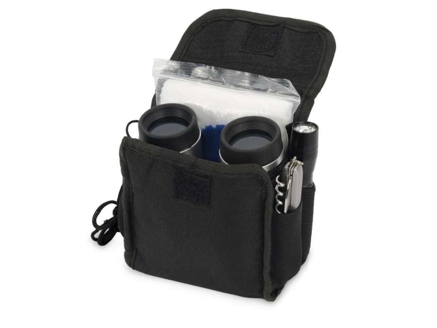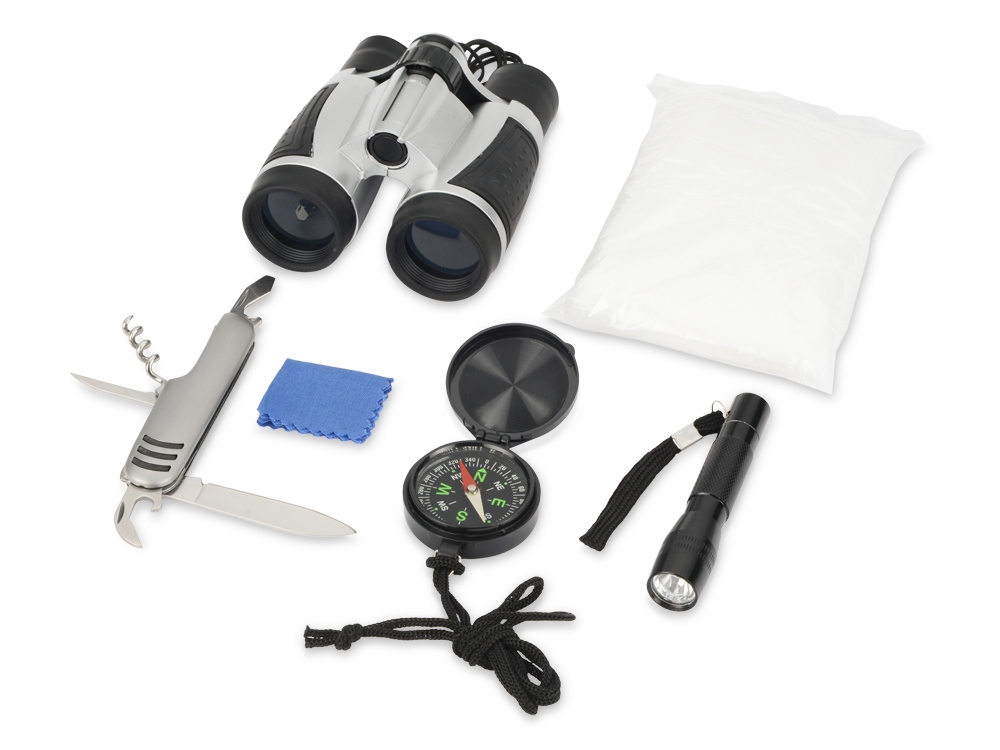 Набор путешественника: бинокль 4х30, мультиинструмент, фонарь, компас, дождевик, салфетка