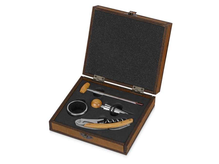 В набор аксессуаров для вина входят штопор-открывалка, воротничок на бутылку, пробка для бутылки и даже термометр. Набор поставляется в презентабельном деревянном футляре. Комплектность: штопор, воротничок, пробка, термометр