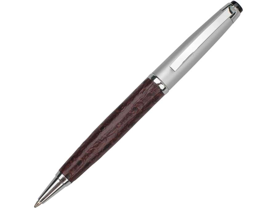 Изюминкой шариковой ручки с поворотным стержневым механизмом является отделка металлического корпуса вставкой из натуральной кожи интересной текстуры. На ручку можно нанести персонализацию методом гравировки.