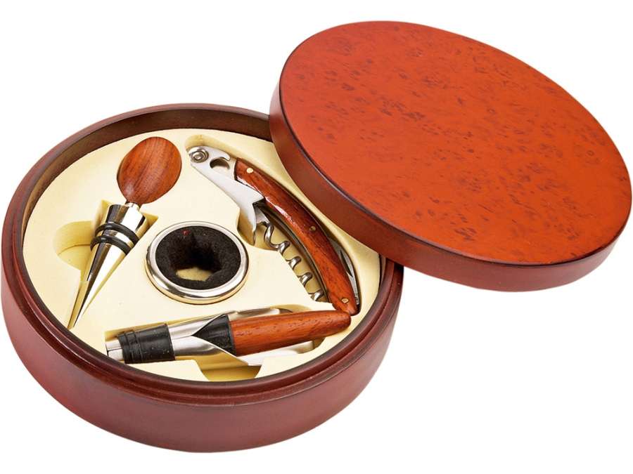 Эффектный набор аксессуаров для вина в круглой подарочной коробке. В набор входят штопор-открывалка - 10, 5х2, 0х1, 0 см; пробка - 10, 5х2, 0 см; воротничок - 2, 0 см х d3, 5см; устройство для аккуратного разлива вина с пробкой 9, 5х2, 0см. Изготовлены из нержавеющей стали. Комплектность: штопор, пробка для бутылки, воротничок, устройство для розлива