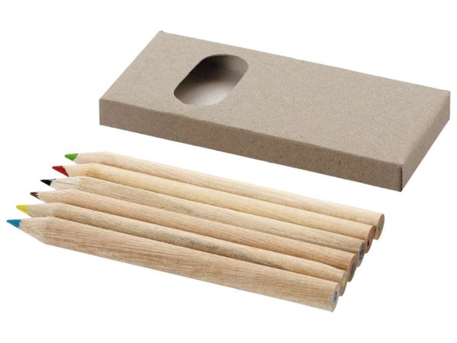 Набор включает в себя 6 цветных карандашей из натурального дерева. На картонную коробку и карандаши можно нанести логотип организации. Комплектность: цветные карандаши - 6 шт. (зеленый, красный, черный, коричневый, желтый, голубой)