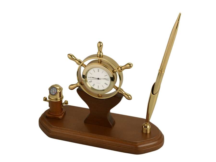 Настольный прибор У руля: часы, термометр, компас, ручка шариковая. Роскошный подарок для руководителей туристических агентств, а также капитану морского судна. Прибор позволит организовать место на рабочем столе и сделать акцент в кабинете. Комплектность: настольный прибор (часы, термометр, компас), ручка шариковая