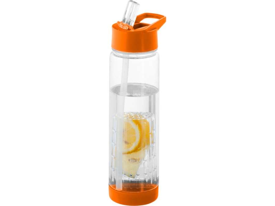 Оригинальная бутылка для воды. Благодаря отделению для фруктов есть возможность создания лимонада на свой вкус. Придется по вкусу любителям натуральных продуктов и здорового образа жизни. Легко разбирается. На пластиковый корпус возможно нанесение тампопечати. Объем – 740 мл. Комплектность: бутылка, ситечко