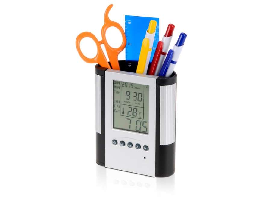Чрезвычайно практичный элемент Вашего рабочего стола подскажет время, температуру и даже дату, а ещё вместит в себя канцелярские принадлежности. Часы оснащены будильником. Полный порядок на столе плюс комфорт за приемлемую цену. Комплектность: батарейка CR2025- 1шт