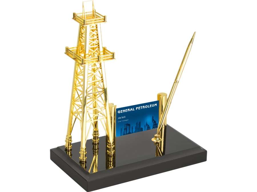 Настольный прибор с вышкой прекрасно подчеркнет специфику работы ресурсодобывающей компании. На приборе расположена визитница и подставка для шариковой ручки. Классическое сочетание черного и золотистого оттенков хорошо впишутся в интерьер. Комплектность: подставка с держателем для визиток, ручка шариковая