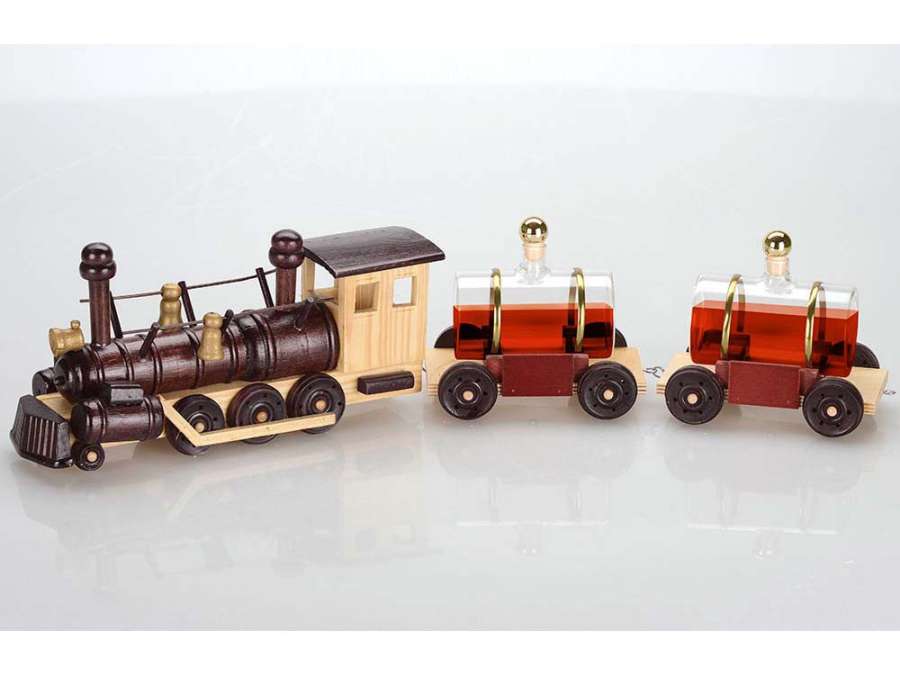Оригинальный подарок для представителей транспортных, логистических и железнодорожных компаний. Графин в форме грузового состава оснащен двумя емкости для виски. Состав выполнен из качественного дерева. Комплектность: графин 200мл- 2шт