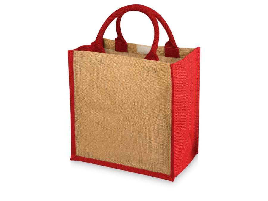 Джутовая подарочная сумка Chennai. Джутовая сумка с ламинированным открытым основным отделением и вставкой. Хлопковые ручки высотой 11, 5 см. Джут.