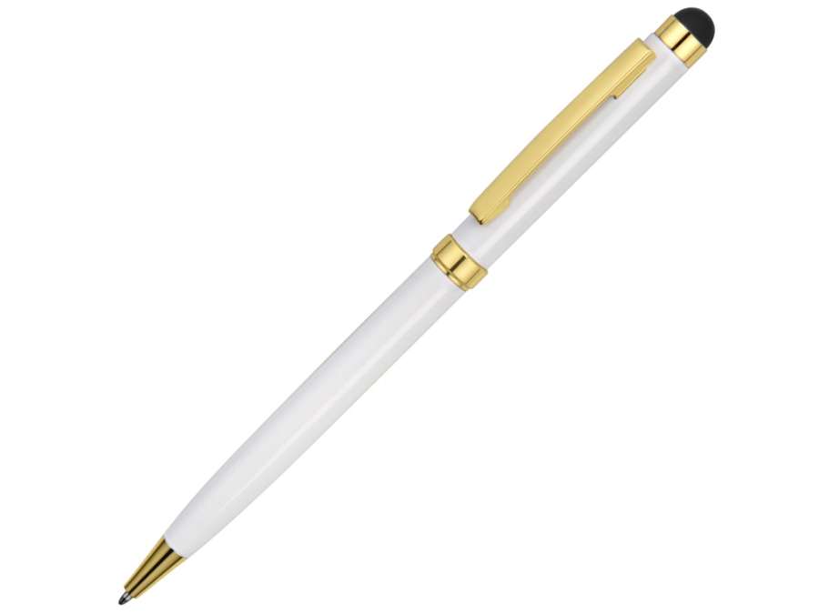 Стильная металлическая ручка со стилусом Голд Сойер – по-настоящему универсальный пишущий инструмент. Ею можно делать записи на бумаге, а перевернув, работать с емкостными экранами с помощью стилуса. Элегантность ручки подчеркивают позолоченные детали: клип, носик и кольцо.