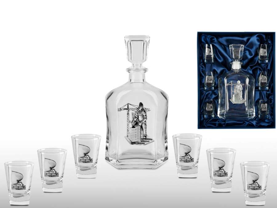 Подарочный набор со штофом СТРОИТЕЛЬ. Традиционная для русского человека комплектация: элегантный графин емкостью 700 мл. с оловянным барельефом СТРОИТЕЛЬ и 6 стопок емкостью 50 мл. с оловянным барельефом Мастерок. Материал барельефов: сплав с содержанием олова не менее 95%(пьютер). Художественное литье, чернение с эффектом антикварного серебра, полировка. Ручная работа. Подарочная упаковка люкс с атласным ложементом синего цвета. Комплектность: штоф 700 мл, стопка 50 мл- 6шт