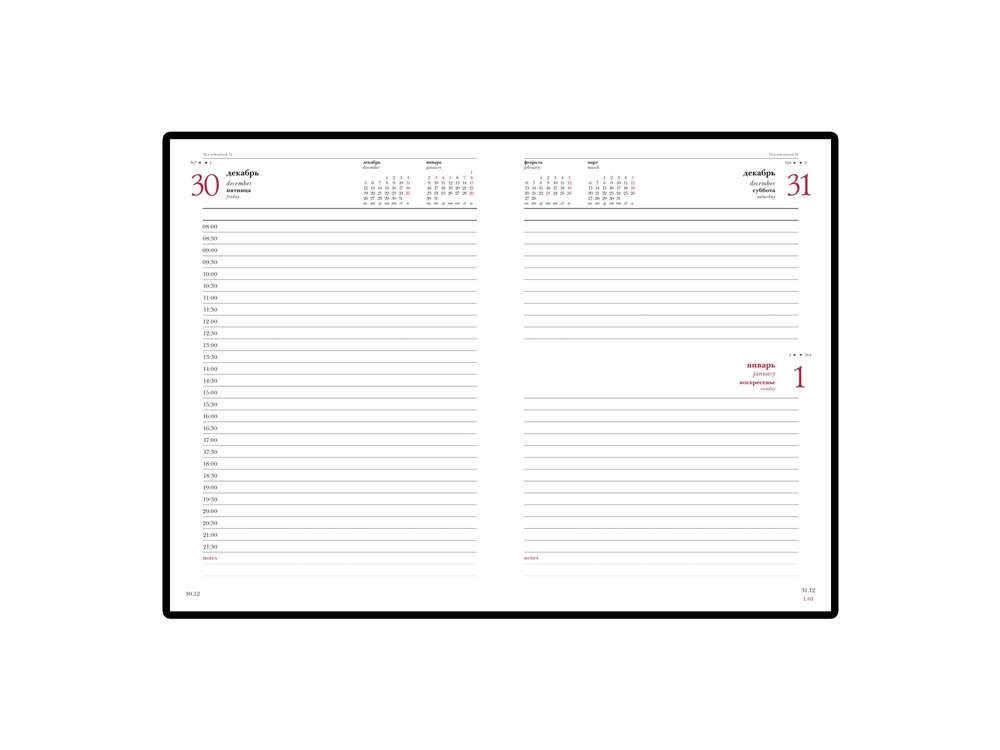 Благородство и статусность придают ежедневнику отстрочка по периметру в тон, скругленные углы, закладка-ляссе бордового цвета, золотой срез.