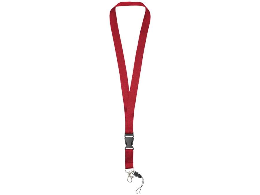 Многофункциональный шнурок с отстегивающейся пряжкой, овальным крючком с зажимом и держателем для телефона. Идеально подходит для бейджа, удостоверения личности или ключей. Предлагается широкий выбор цветов с большим участком для нанесения логотипа. Полиэстер.