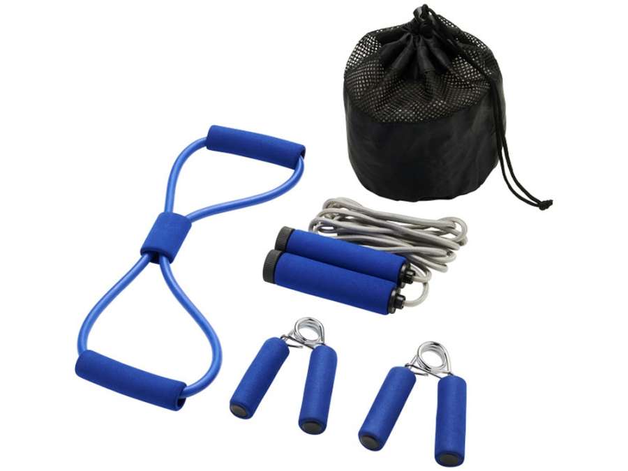 Набор для фитнеса Dwayne содержит весь спортивный инвентарь, необходимый для полноценной тренировки. Два кистевых эспандера, скакалка и грудной эспандер в соответствующем цветовом исполнении. Для удобной переноски поставляется в сетчатом мешочке, на котором можно сделать нанесение. Полиэстер. Комплектность: кистевой эспандер - 2шт, скакалка, грудной эспандер