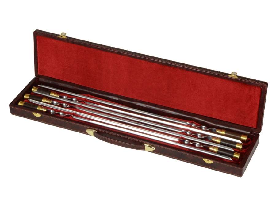 Набор шампуров Охотничий для любителей выездов на природу и уникальных подарков. Поставляются в дипломате из натуральной кожи. Шампура выполнены из нержавеющей стали и имеют ручки из натурального дерева. Каждый шампур изготовлен в виде шпаги. Идеальное решение для подарка человеку, у которого уже есть все. Комплектность: шампур 660 х 10 х d20 мм- 6 шт
