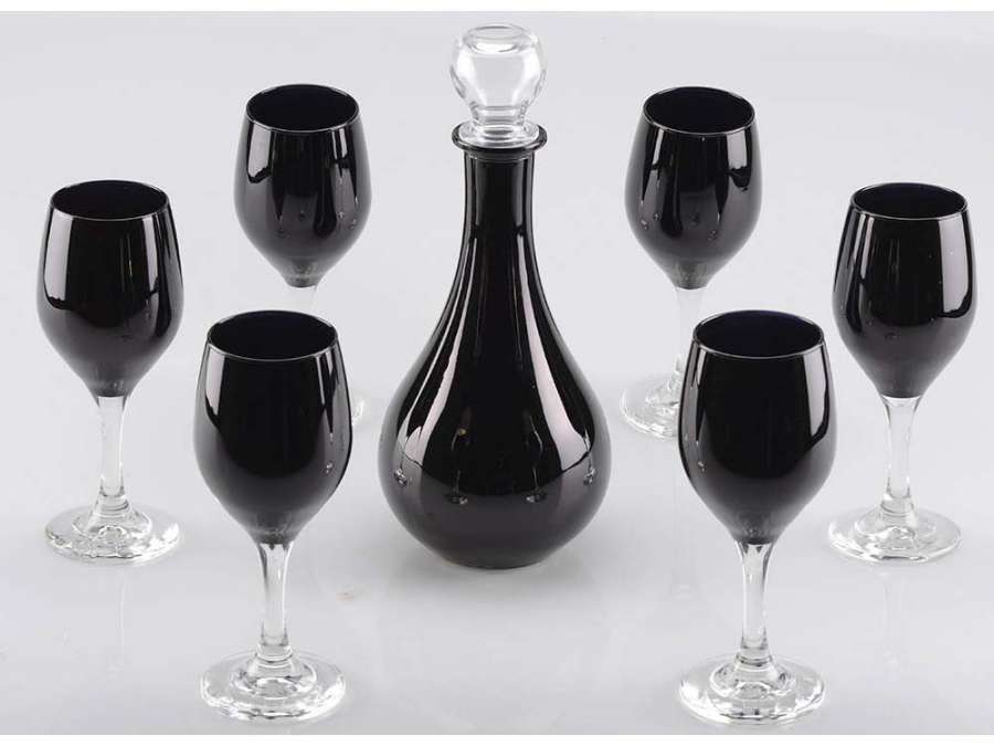 Подарочный набор посуды для вина включает в себя 6 бокалов и графин. Набор выполнен из тонкого прозрачного и черного стекла. Ручная работа. Плавность форм и изумительный внешний вид не оставит равнодушным даже самых требовательных людей. Комплектность: графин 1200мл, бокал 400мл- 6шт