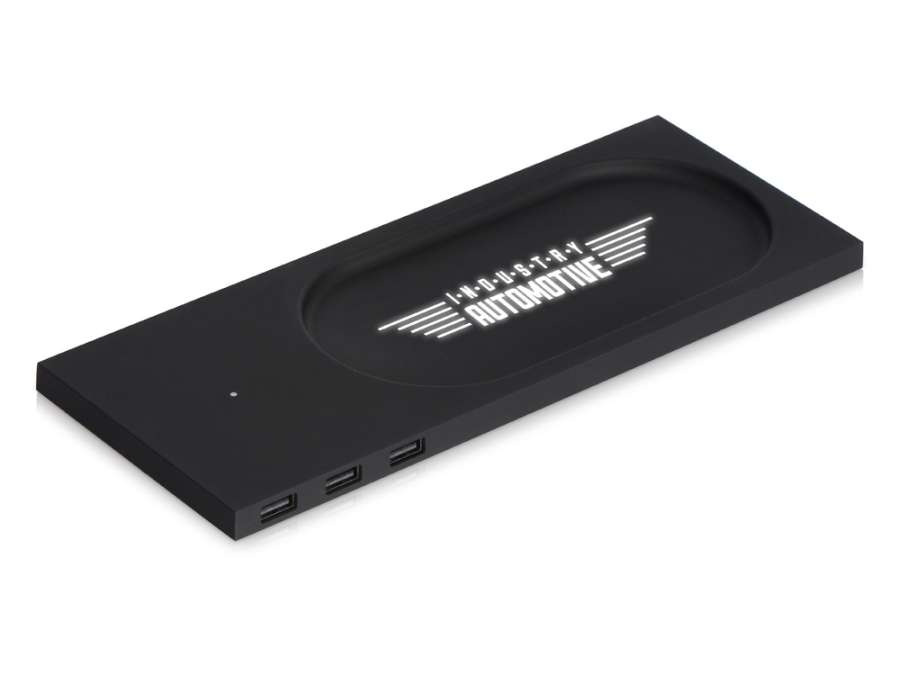 Беспроводное настольное зарядное устройство Glide выполнено из пластика с покрытием soft-touch. Кроме функции беспроводной зарядки имеет также 3 зарядных USB-разъема. Компактный органайзер имеет отсек для мелочи. После гравировки на устройстве вскрывается белый цвет подсветки, что позволяет сделать необычную и стильную персонализацию на этом гаджете. Комплектность: беспроводная зарядка, кабель USB-Micro, инструкция