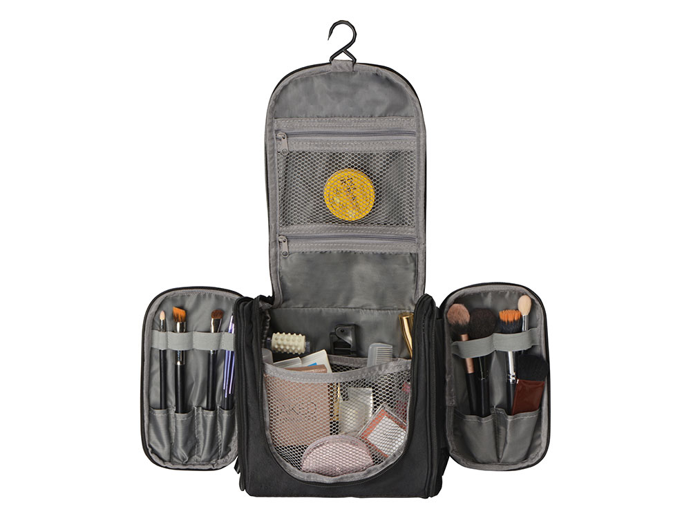 • Снабжен ручкой для удобства переноски и крючком, позволяющим подвесить несессер в ванной комнате гостиничного номера или любом другом месте