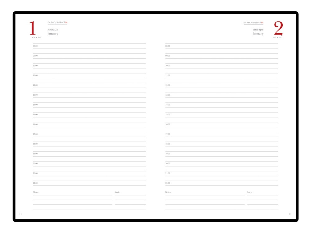 В ежедневнике есть полезная справочная информация и телефонная книга, а также страницы для записи идей, мыслей и составления рабочих планов. Есть перфорация (нижние уголки отрывные). Для изготовления страниц используется качественный бежевый офсет повышенной плотности (80 г/кв м), которая производится японской фирмой Daiwa и подходит для всех видов чернил.
