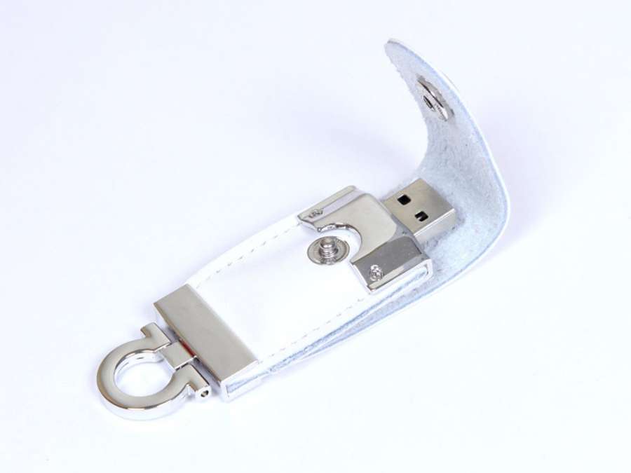 Флеш-накопитель из натуральной кожи с металлическими вставками, в виде брелока для ключей, объем памяти 32 Гб. Кожаный корпус.
