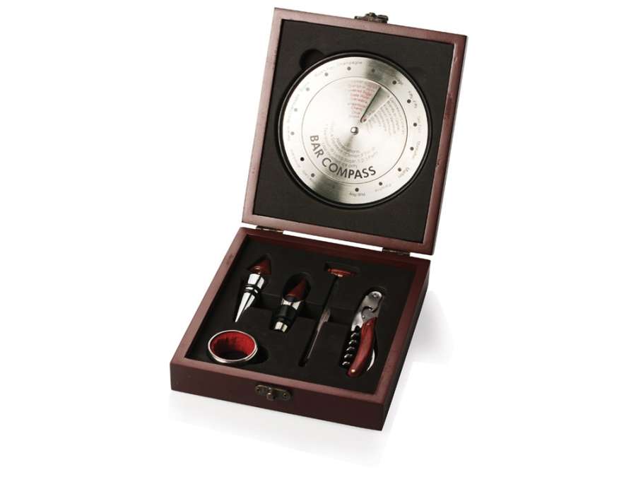 Подарочный набор придется по вкусу любому гурману. В комплект входят штопор-открывалка, пробка для бутылки, устройство для аккуратного розлива вина, термометр, воротничок на бутылку. Набор упакован в деревянный подарочный футляр, на верхней крышке футляра с внутренней стороны смонтирован оригинальный бар-компас с рецептами. Комплектность: бар-компас с рецептами, штопор, пробка, устройство для розлива, термометр, воротничок