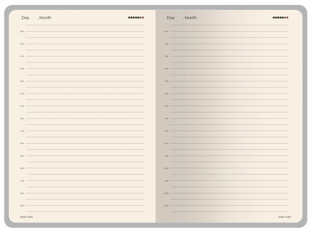 Отличительной особенностью ежедневника является горизонтальная, скрепляющая обложку и блок, тоненькая резинка. Оригинальное решение позволяет раскрывать ежедневник на 180 градусов и вести записи у самого края корешка. Для фиксации второй резинки, не позволяющей ежедневнику раскрываться, предусмотрена выемка на обложке. Обложка тонка, но фактурность придает ей элемент брутальности, а бархатистое нанесение на ее оборотной стороне- благородство и статусность. Картонный карман для визиток, записок, бумаг – функциональная деталь и приятная дополнительная опция. Бумажный блок изготовлен из бумаги бежевого цвета, плотностью 70 г/кв. м и содержит 272 страницы, 23 из которых справочная информация.