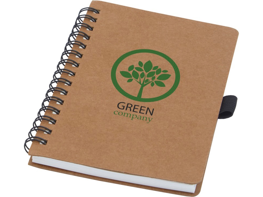 Блокнот на пружине формата A6, изготовленный из переработанного картона, с петлей для ручки. Содержит 70 листов в линию плотностью 60 г/м², изготовленных из каменной бумаги. В производстве каменной бумаги не используется дерево, а на сам процесс изготовления затрачивается гораздо меньше энергии в сравнении с производством переработанной или целлюлозной бумаги. Бумага водонепроницаемая и стойкая на разрыв. Имеет естественный белый цвет (без отбеливания).