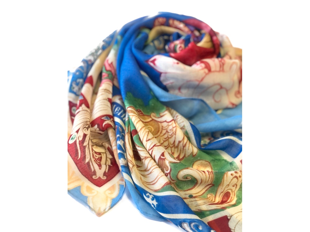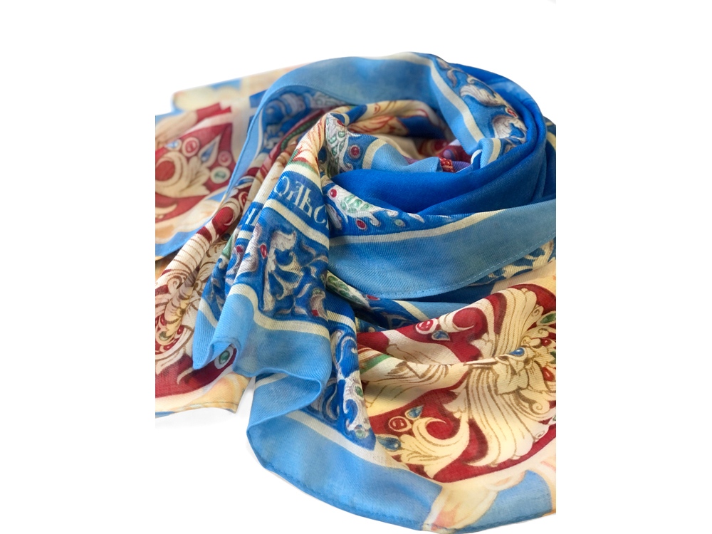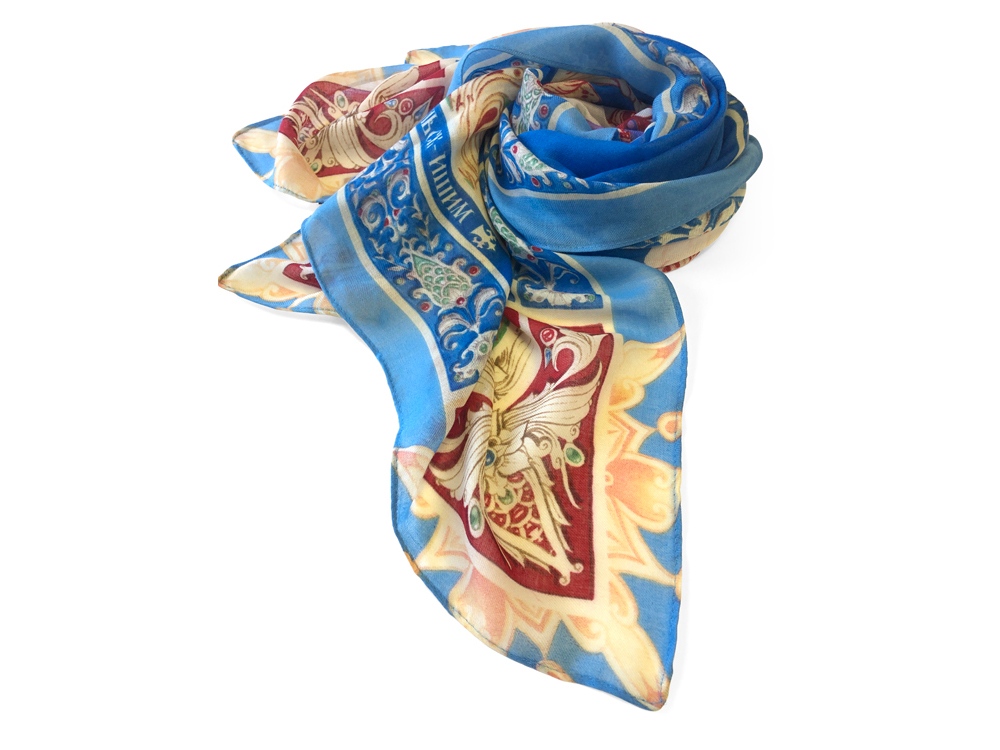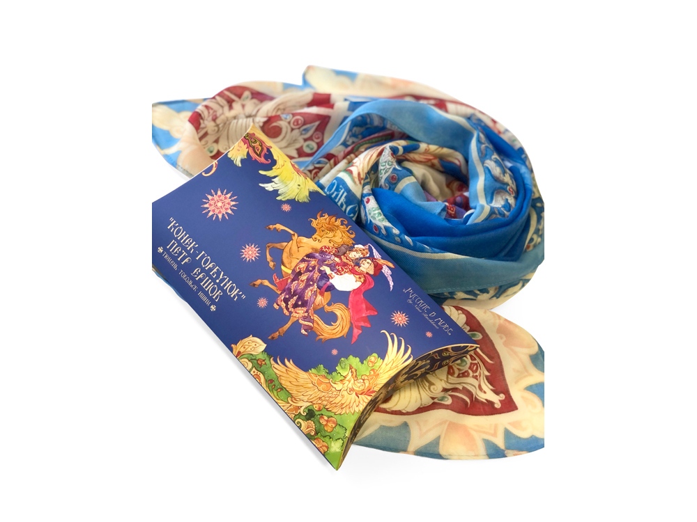 Прочитав сказку юного дарования, сам великий Александр Сергеевич Пушкин сказал: Этот род сочинений я могу теперь оставить - и Петр Ершов был принят в круг петербургских писателей. В этом году сказке из золотого фонда русской литературы, переведенной на все языки мира, исполняется 185 лет. Ее яркие краски мы перенесли на шелк и создали платок Конек-Горбунок. Благодаря тонкой работе дизайнера, со страниц книги, как живые, сошли герои любимой с детства истории: Иван, прекрасная Царь-девица и волшебный Конек-Горбунок. А в роскошных орнаментах сплелись легендарное перо Жар-птицы, Красное Солнышко и Месяц…