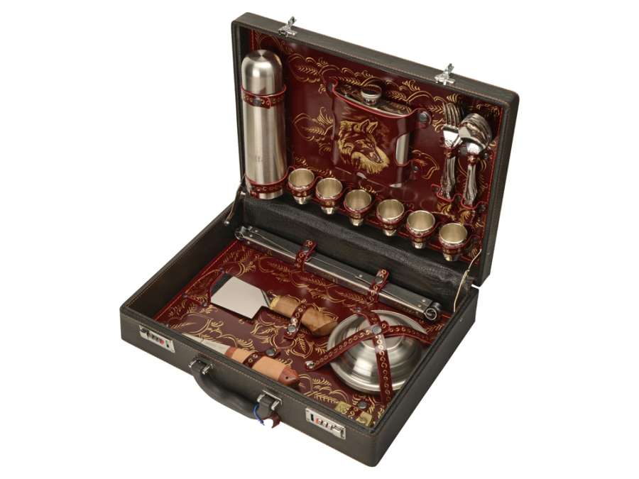Зажигалка 3, 6 х 1, 3 х 6 см - 1шт Комплектность: нож, нож-тяпка, зажигалка, тарелка, шампур- 6шт, термос, стопка- 6шт, фляжка, вилка - 6шт, ложка - 6шт