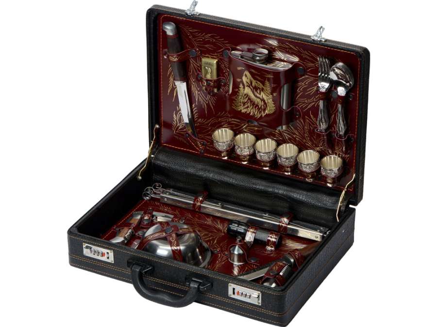 Фонарик d3 х 9, 5 см - 1шт Комплектность: нож складной, штопор, тарелка-6шт, воронка, ножБасмач, стопка-6шт, ножКореш, зажигалка, стопка с узором-6шт, фляга, ложка-6шт, вилка-6шт, фонарь