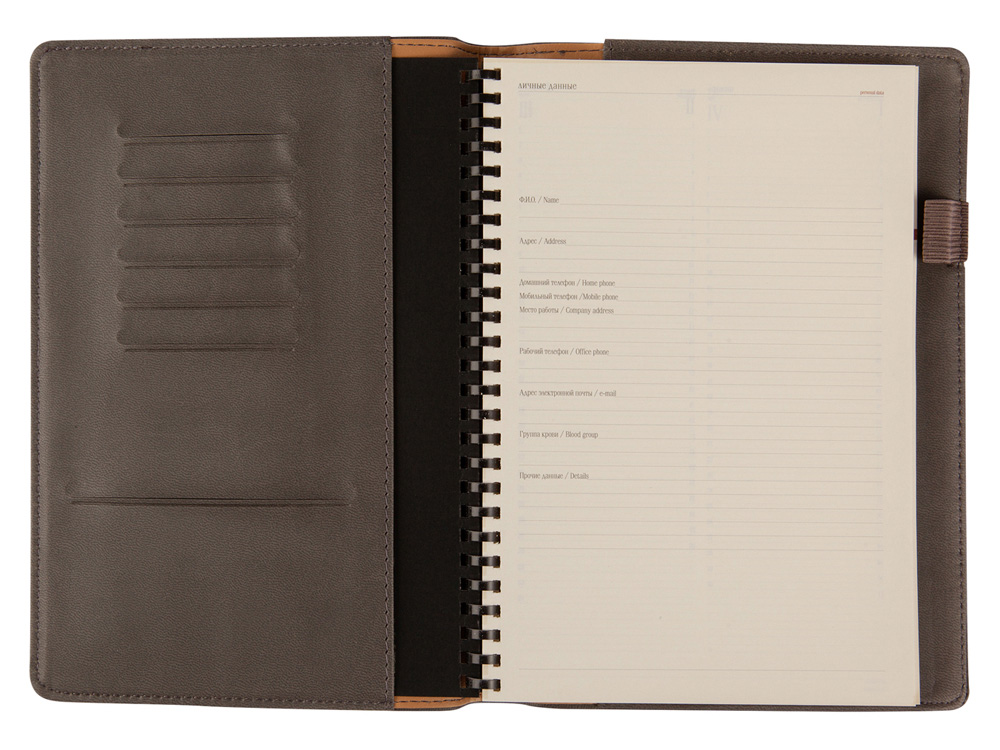 Блок является сменным и вставляется внутрь обложки. С внутренней стороны обложка имеет вырубные отделения для визиток и кредитных карт, а также петлю для ручки на резинке. Для хранения чеков, записок и бумаг внутри расположен прозрачный пластиковый конверт.