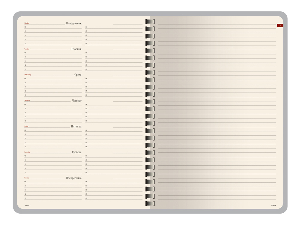 Недатированный блок состоит из 128 страниц, укреплённых на пластиковом полускрытом гребне. На 21 странице размещена справочная информация на русском языке. День недели указан на русском и английском языках.