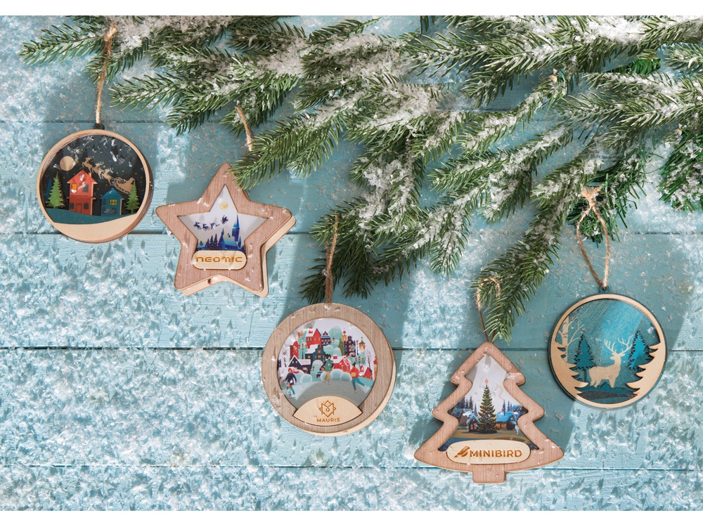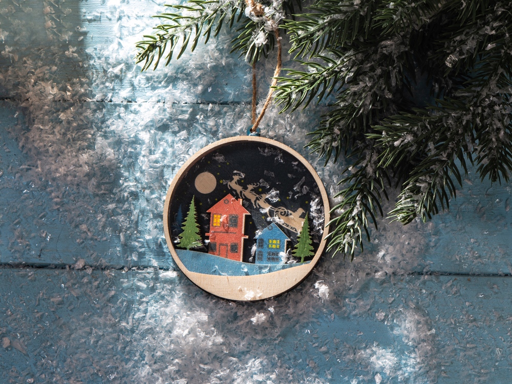 Новогодняя игрушка выполнена из трех слоев фанеры, домики, небо и елочки, изображенные на ней, расположены на разных уровнях, что позволяет создать выпуклый рельеф. Весь зимний пейзаж выглядит объемно, создавая праздничное настроение.