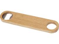 Открывалка для бутылок из нержавеющей стали с деревянной поверхностью. Имеет вешалку на ручке. Дерево, нержавеющая сталь.